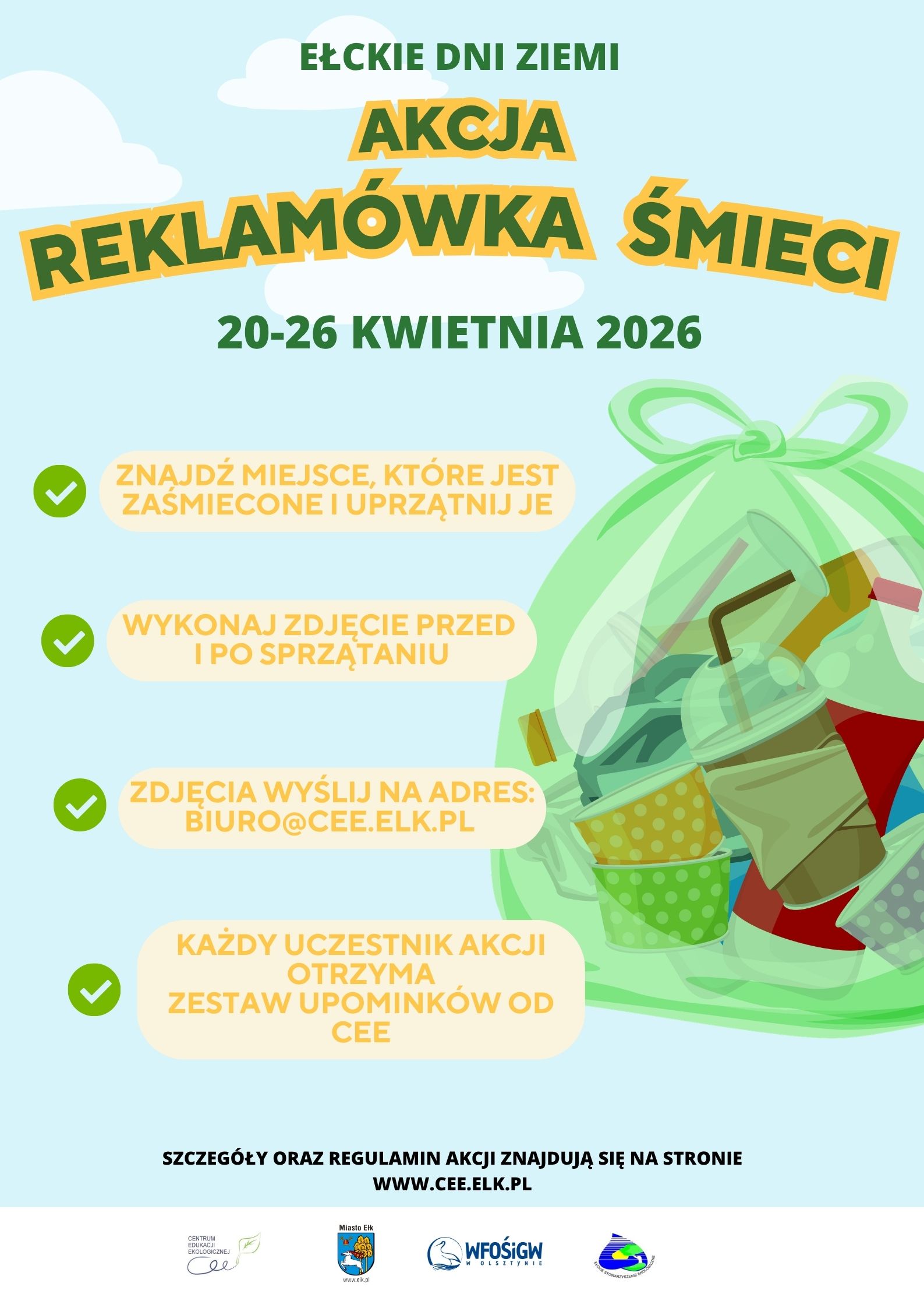 W ramach obchodów Ełckich Dni Ziemi zapraszamy do udziału w akcji "Reklamówka śmieci", celem której jest zebranie odpadów porzuconych w lasach, parkach i nad jeziorami. W ten sposób chcemy zachęcić społeczeństwo do zmiany myślenia na temat odpadów opakowaniowych i propagować ideę recyklingu. Uczestnik, aby wziąć udział w akcji, musi udokumentować fotograficznie miejsce które będzie sprzątał, a następnie wykonać zdjęcie reklamówki ze śmieciami na tle posprzątanego miejsca.