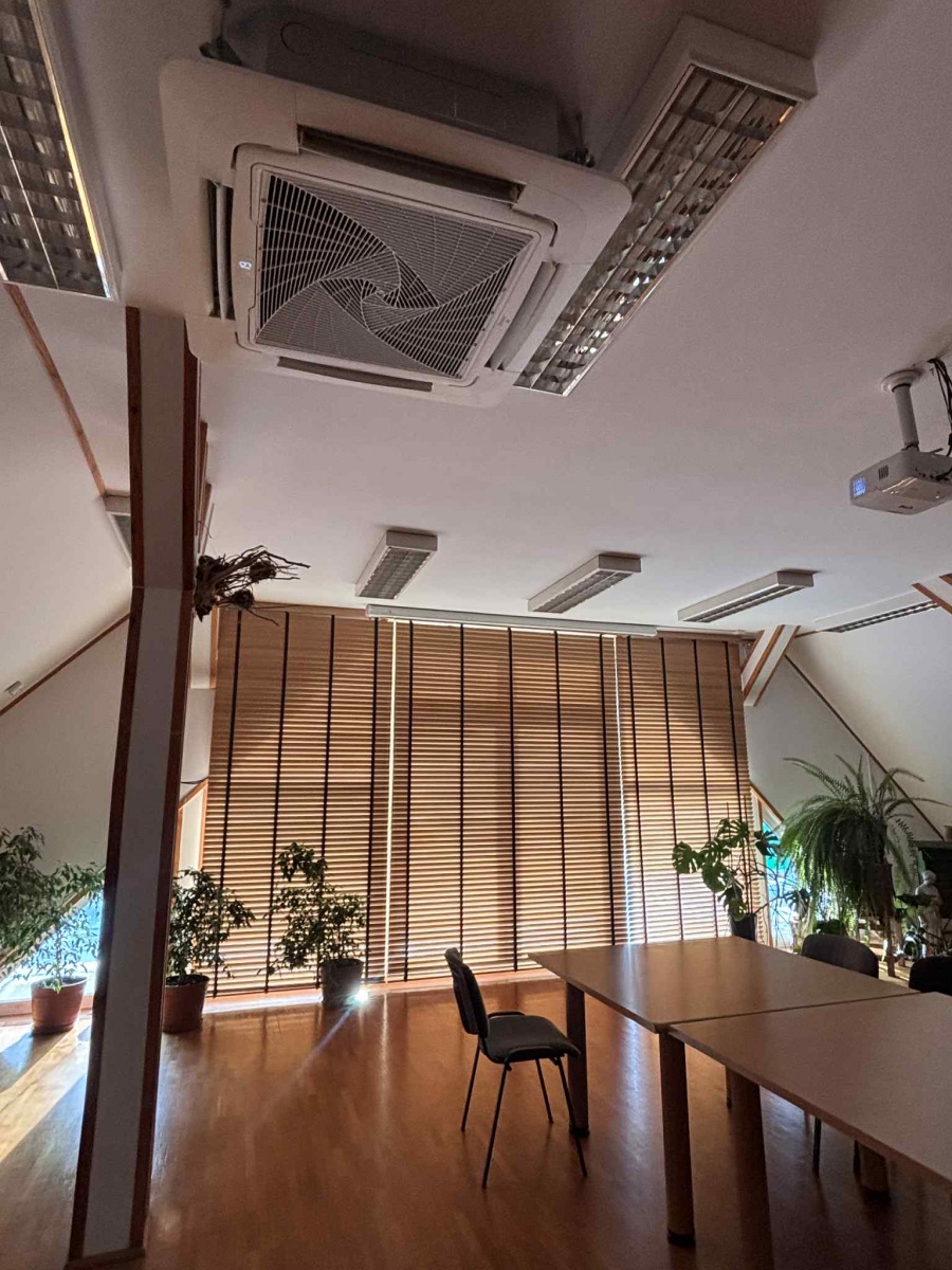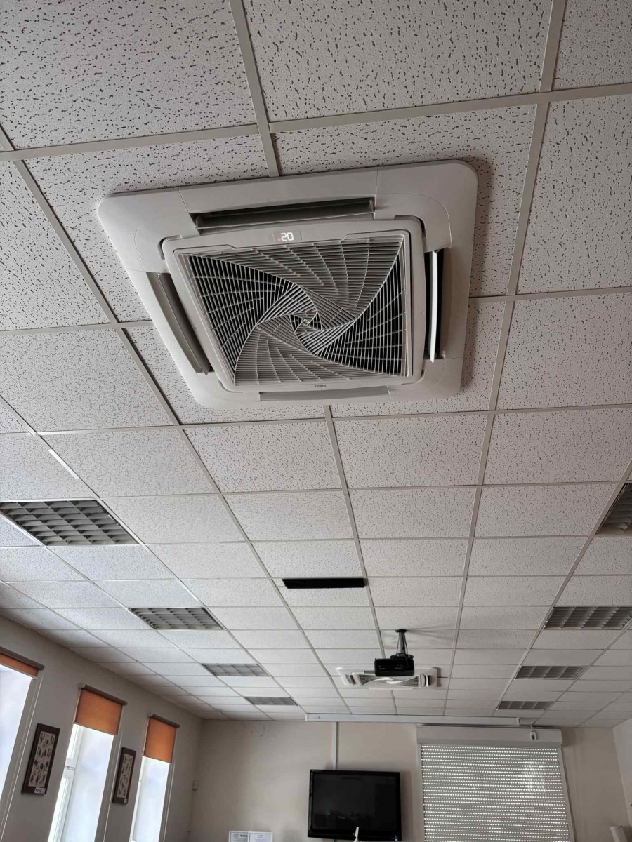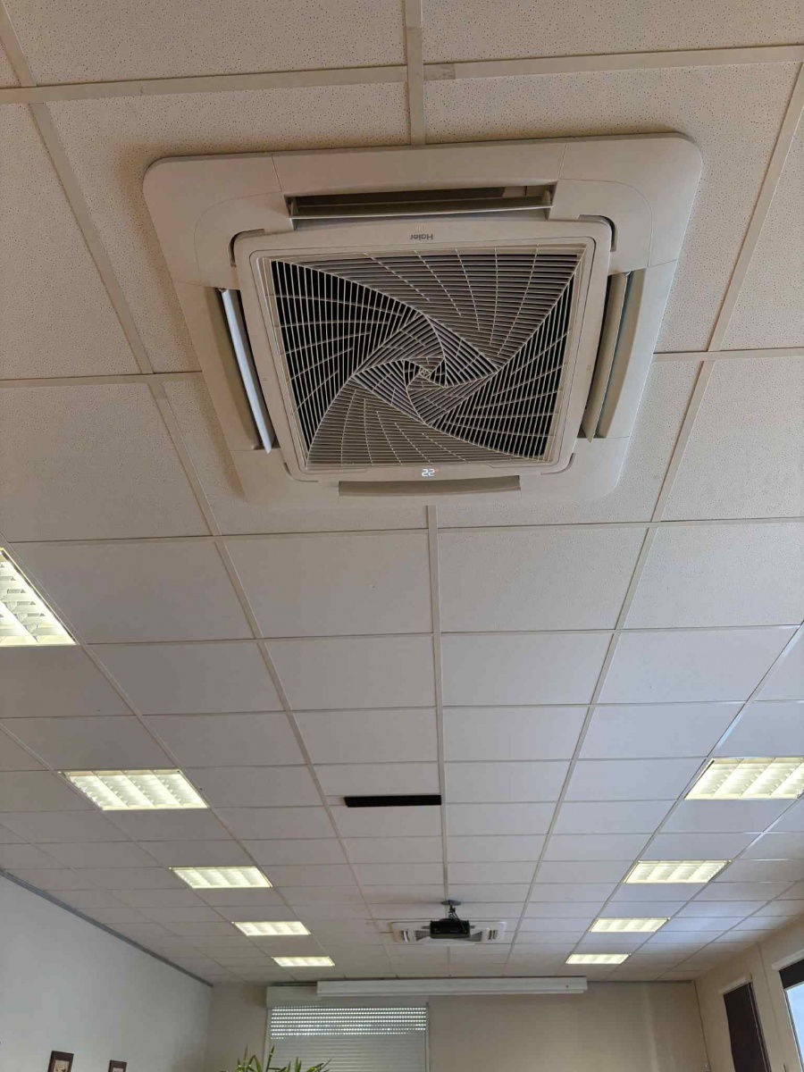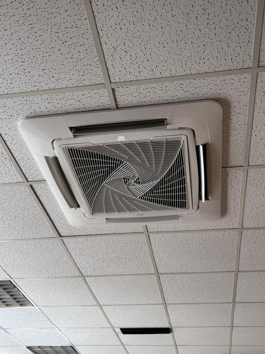 Montaż układu klimatyzacji typu multisplit o mocy 12,5 kW. Układ oparty o dwie jednostki wewnętrzne kasetonowe o mocy 7,1 kW ze sterownikami bezprzewodowymi, odporwadzenie skroplin do najbliższego pionu kanalizacyjnego od każdej jednostki wewnętrznej poprzez zasyfonowanie, agregaty zewnętrzne umieszczone na ścianie budynku na systemowych uchwytach.